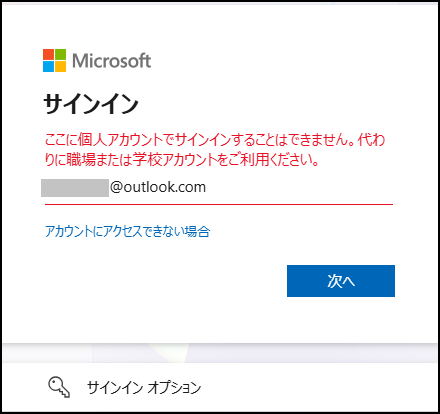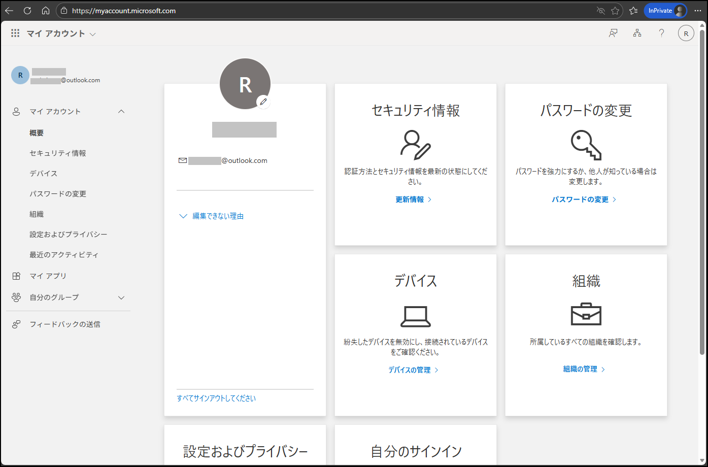 これで組織アカウントでアクセスした場合と同じ「マイ アカウント」が表示されます。アカウントのエイリアス(メール アドレス)がテナントのドメインではなく「outlook.com」になっていることが確認できます。