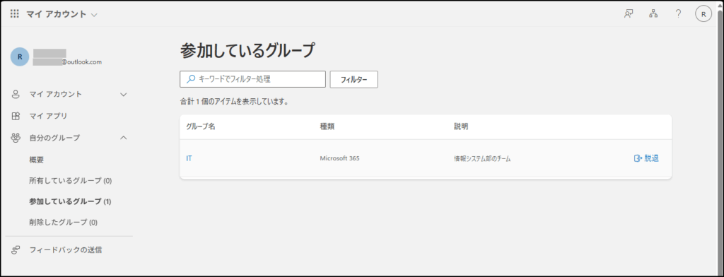 また「自分のグループ」から現在サインインしている組織で自分が参加しているグループ(Microsoft 365 グループ, Teams のチーム)を確認することもできます。