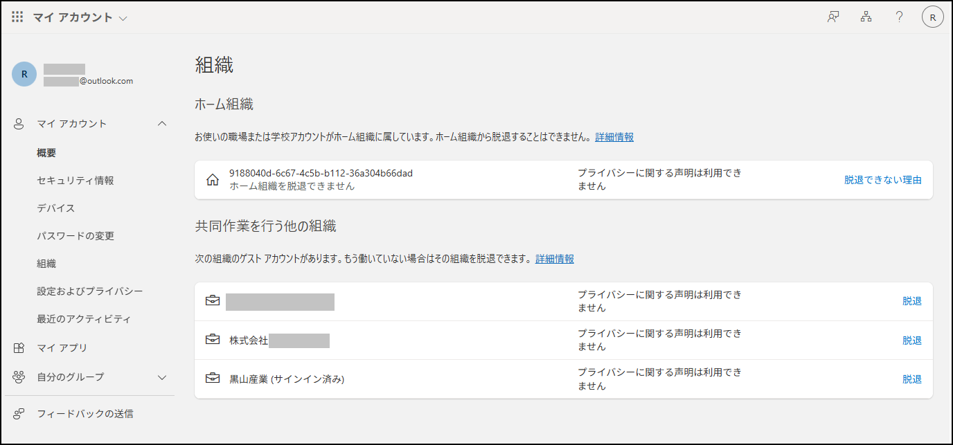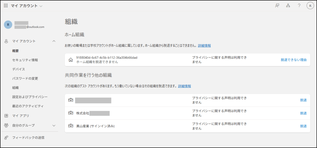 自社で Microsoft 365 を導入していないなどの理由で、個人用の Microsoft アカウントで外部の組織にゲスト参加している場合も https://myaccount.microsoft.com から確認や脱退を行えますが、https://myaccount.microsoft.com にアクセスして….