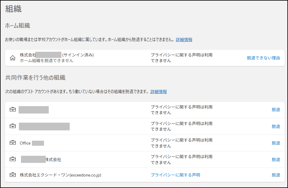 「組織」の画面ではゲスト参加している組織には [脱退] リンクが表示されていますので、これをクリックしてもうアクセスしない組織へのゲスト参加を取り消すことができます。