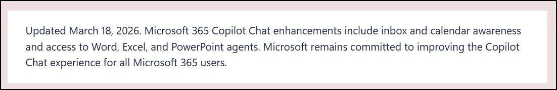 「Copilot Chat の機能拡張」が具体的に何かは先のページ(英語版の方)に追記されています。その内容は「Microsoft 365 Copilot Chat enhancements include inbox and calendar awareness and access to Word, Excel, and PowerPoint agents. 」と書かれています。