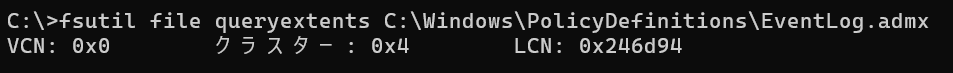 実際に物理的な断片化が発生してるかは、エクステントが連続しているかを確認する必要があります。この結果に表示されている VCN は仮想クラスター番号、LCN は論理クラスター番号で、「LCN の値+クラスターの値」と次の行の LCN の値が一致している場合、エクステントは連続しています。