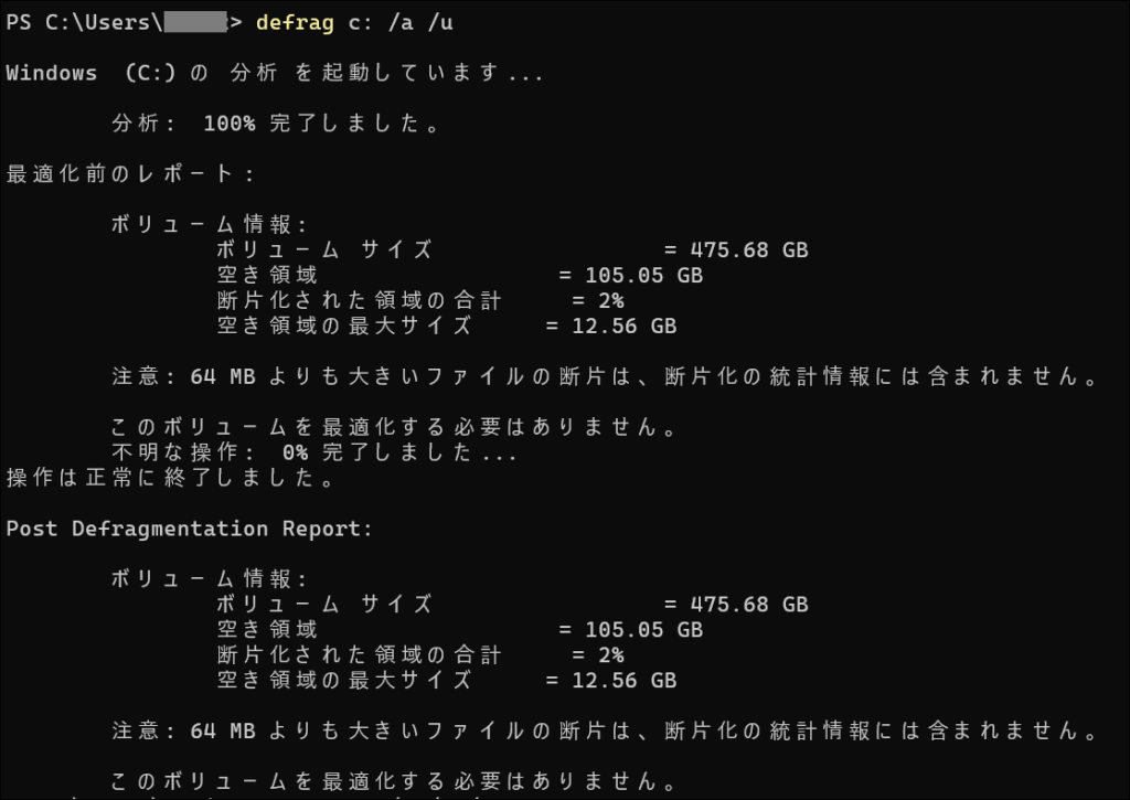 を実行すると、C ドライブの断片化の分析と結果の表示が行われます。「C:」の部分を他のドライブ名に置き換えれば、別のドライブの分析ができます。