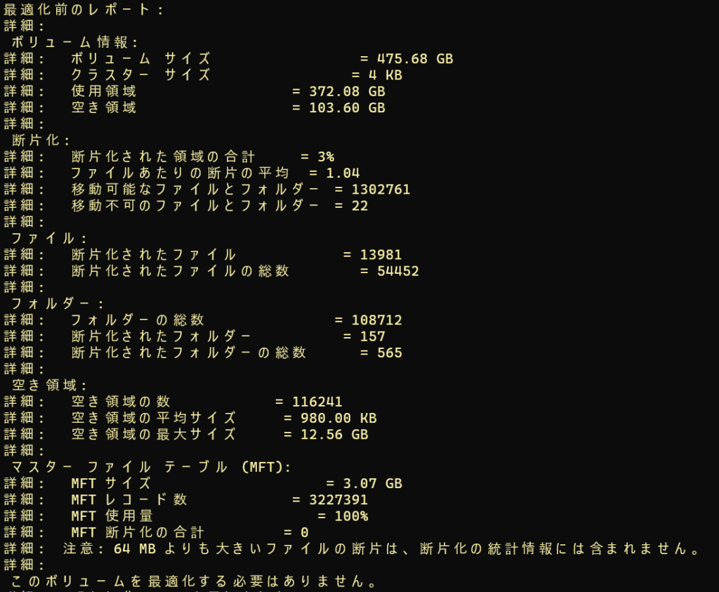 ディスクの断片化がどの程度発生しているのかは、コマンドを利用して調査できます。管理者として実行したコンソールで、