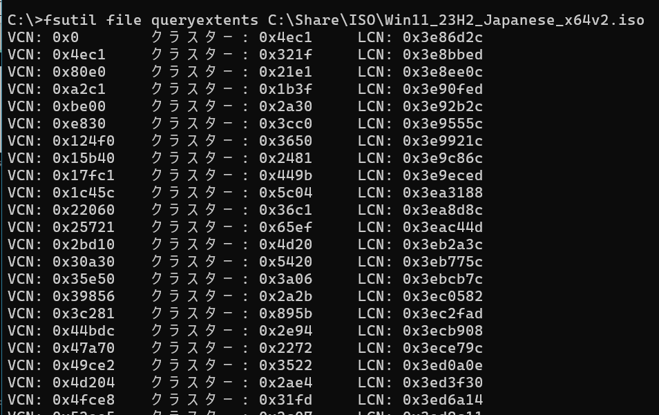 以下は Windows のインストール イメージ ISOファイルについてコマンドでコマンドを実行したスクリーンショットです。このようにファイルが格納されている状態が表示されますので、断片化の状態を把握できます。ただしここで表示されているのは「エクステント」で、ファイル・システム内のファイル用に予約された連続したストレージ領域のことです。そのためエクステントが別れていても実際の配置が不連続とは限りません(エクステントは管理用の単位であって、物理的な単位ではないため)。
