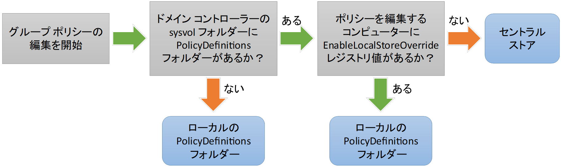 - ドメイン参加の場合:ドメイン コントローラー上のセントラル ストアから、セントラル ストアが無ければローカル コンピューターの C:\Windows\PolicyDefinitions フォルダーから