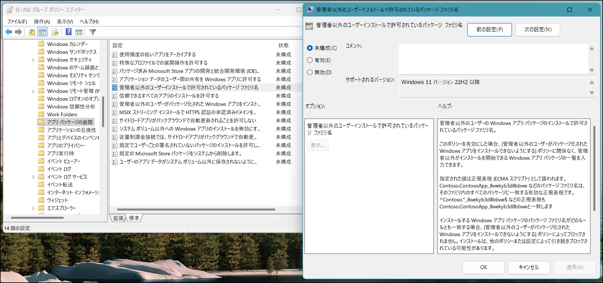 例えば、[コンピューターの構成]⇒[管理用テンプレート]⇒[Windows コンポーネント]⇒[アプリ パッケージの展開] にある「管理者以外のユーザー インストールで許可されるパッケージ ファミリ名」ポリシーは 2026 年 1 月の累積的更新プログラムで管理用テンプレート AppxPackageManager.admx に追加されています。