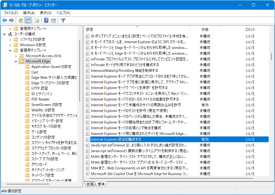 - [管理用テンプレート] – [Microsoft Edge] -[Internet Explorer 統合を構成する]