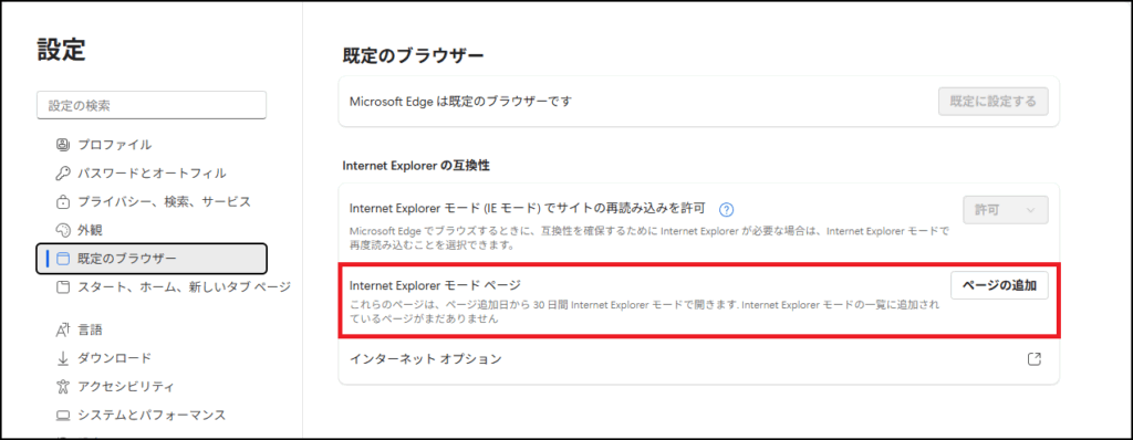 このような理由で非表示となっているので、基本的には安全面を考えて「Internet Explorer でモードで再読み込みする」は非表示のまま利用することが推奨されます。IE モードで表示しなければならないページは、[設定] – [既定のブラウザー] – [Internet Explorer モード ページ] で事前に URL を登録できます。