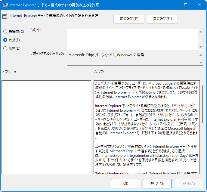 有効:IE モード - [管理用テンプレート] – [Microsoft Edge] -[Internet Explorer モードで未構成のサイトの再読み込みを許可]