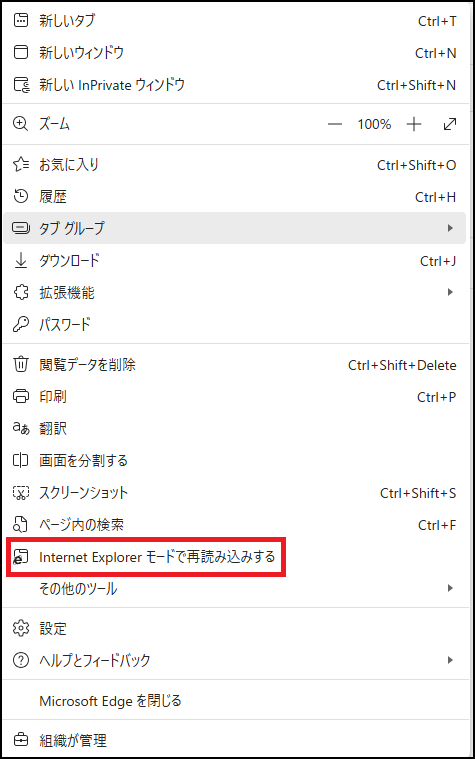 従来は、Edge の設定ボタン(ウィンドウ右上の […])から「Internet Explorer でモードで再読み込みする」を選択することで表示中の Web ページを IE モードで再読み込みして表示できました。また「Internet Explorer でモードで再読み込みする」はツールバーにボタンとして表示させることも可能でした。