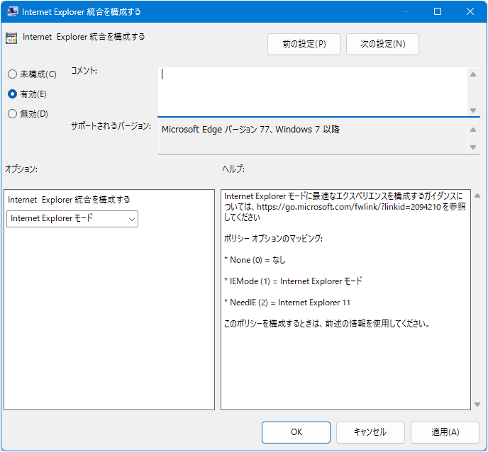 - [管理用テンプレート] – [Microsoft Edge] -[Internet Explorer 統合を構成する]