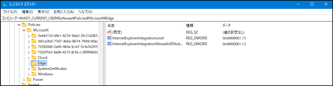 - キー: HKCU\Software\Policies\Microsoft\Edge